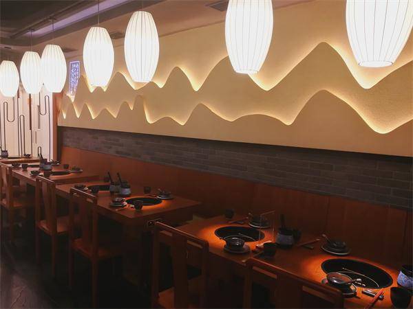 餐厅内的照明也紧随潮流选择了工装吊灯,通过餐厅座位区和背景墙的多元设置,实现提供餐饮、商务和休闲的多种功能。