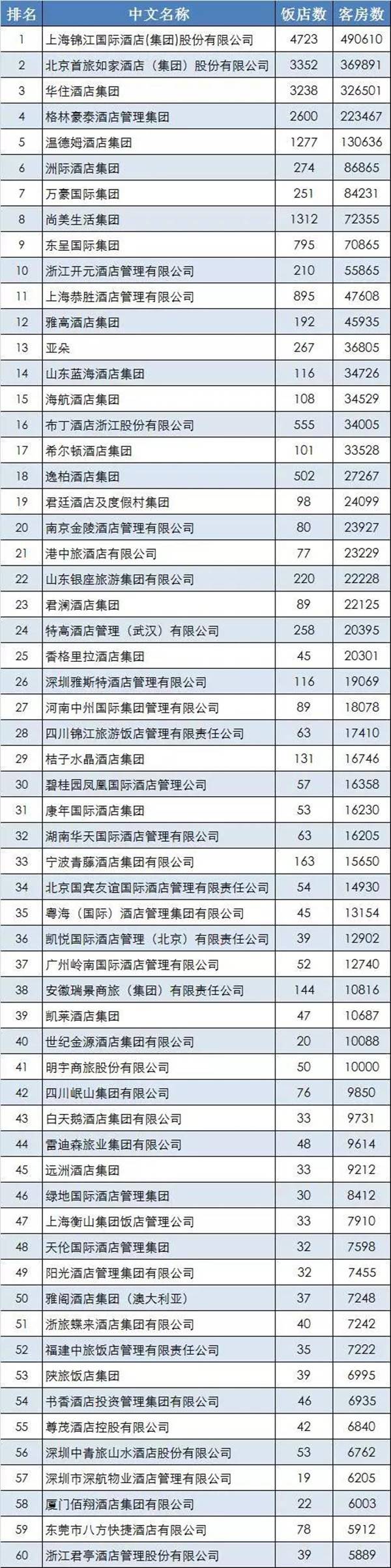 据中国旅游饭店业协会相关负责人介绍,其统计对象为:经工商管理部门审批,在中国境内开展饭店管理业务的饭店管理公司(集团),截止2016年12月31日已签订正式管理合同并开业的饭店。含本饭店管理公司(集团)在中国境内以委托管理、特许经营、投资兼管理、租赁兼管理等方式管理的饭店,不含顾问式管理及咨询管理的饭店,不含拥有饭店产权但委托其他企业管理或使用其他企业的“品牌”的饭店。相关数据由各饭店管理公司(集团)自行填报并对其负责。