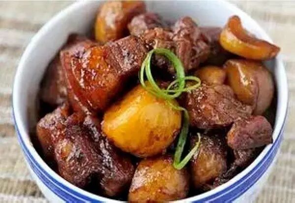 五花肉500板栗20姜适量老抽2汤匙料酒1汤匙食盐少许冰糖10小葱1