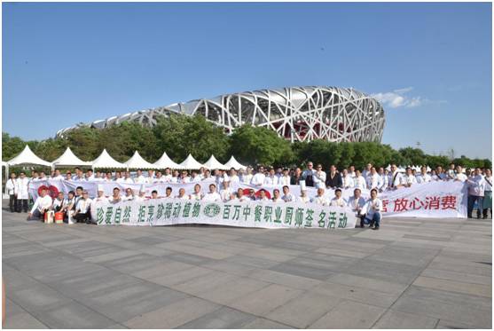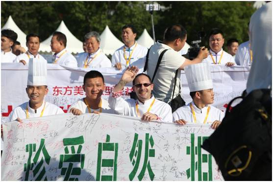 在颁奖晚宴开始前,所有与会的中外嘉宾和受奖团体与个人,以及东方美食集团的员工在鸟巢广场举行了三百人大签名和宣誓仪式,再次向全球餐饮人倡议:严守匠心、亮德、拒烹、裸烹等健康食业理念,用良心烹饪,换顾客放心消费的宣誓,令在现场的人无不感到热血沸腾。