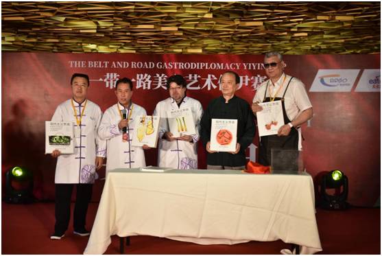 食学学科体系奠基人、北京东方美食研究院院长刘广伟先生,一带一路美食艺术伊尹赛评委会主席、大董餐饮集团创始人董振祥先生,一带一路美食艺术伊尹赛总裁判长 屈浩先生为“一带一路”美食艺术伊尹团体赛大奖得主:北京大董烤鸭店、徐记海鲜、新荣记、真知味、小厨娘淮扬菜、广州半岛餐饮集团、德悦餐饮集团、武汉丽华园酒店颁发奖杯。