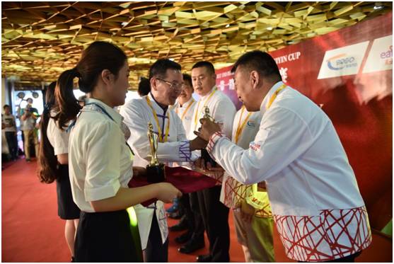 伊尹海参管理有限公司董事长张洪先生、哈尔滨莲花渔村董事长周义勇先生、长春老妈厨房董事长关鑫先生、北京满满海餐饮集团董事长李晓波先生为“一带一路”美食艺术伊尹赛个人赛银奖(国内):吴学龄、邵庆宏、高飞、李贺明、刘功明、王景荣、梁小清、段辉煌、林庆祥、周伟武、赖建全颁发奖杯。