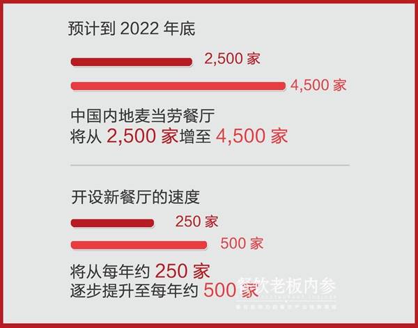 预计到2022年底,中国内地麦当劳餐厅将从2500家增至4500家,开设新餐厅的速度将从每年约250家逐步提升至每年约500家。