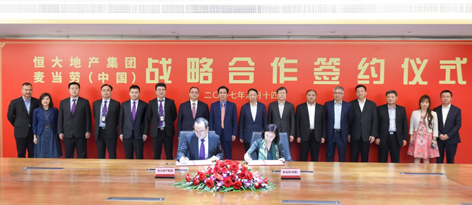 8月14日,恒大地产集团与麦当劳(中国)签订长期战略合作协议,恒大集团董事局主席许家印,恒大集团董事局副主席、总裁夏海钧,恒大集团常务副总裁兼恒大地产集团总裁时守明;中国中信集团董事长常振明,中信集团总经理助理兼中信证券董事长张佑君,中信银行行长孙德顺,中信资本董事长兼麦当劳中国董事会主席张懿宸等出席了签约仪式。