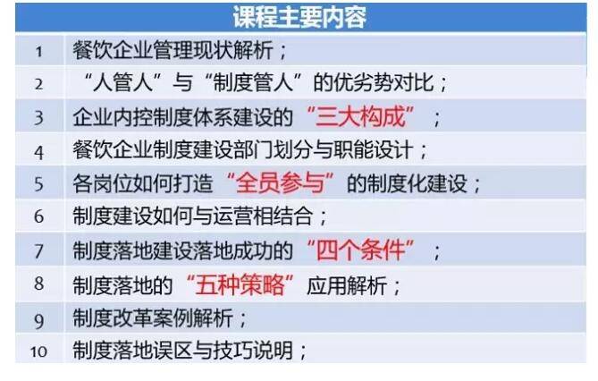 不会编制制度、不会使用制度、制度遭到排斥、制度不能落地及落地不能升级等诸多问题,课程内容如下: