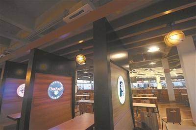 这里有餐厅卡座装配篮球灯及NBA球队LOGO灯箱,墙上的运动绘画很生动,座椅背都是篮球、足球、跑道等运动图案。
