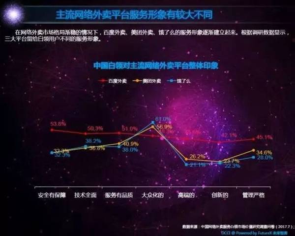 数据发现,在外卖平台的消费者印象分布图中,百度外卖得分最高的三项为“安全有保障”、“技术全面”、“服务有品质”,占比数据分别为53.8%、50.3%、51%,为全行业最高。