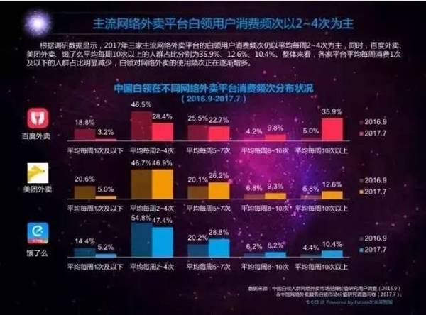 《报告》提到,2017年三大外卖平台的白领用户消费频次仍以平均每周2-4次为主,平均每周消费1次及以下的人群占比明显减少,白领对网络外卖的使用频次正在逐渐增多。
