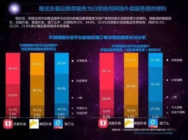 从《报告》来看,各外卖平台消费个性化推荐能力有所差距,导致不同平台的白领用户对餐品推荐服务、信息推送服务的感知有所不同。