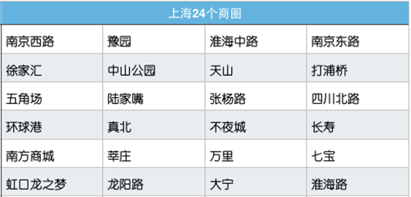 上海地区的榜单,按照上海24个商业中心为定点整理。