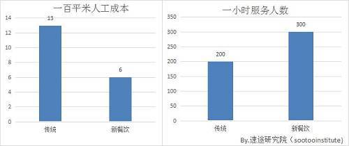 在传统餐饮业中,一百平米大小的店面大概需要13个人左右,而在新餐饮模式下同比的店面大概只需要6个人左右;在一小时的时间内传统餐饮行业大概可以服务200人左右,而新餐饮模式下大概可以服务300人。