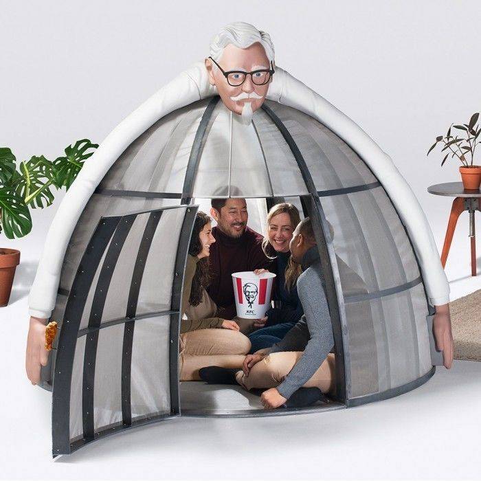 帐篷本身并不大,但顶部却趴着一个「慈祥的」肯德基爷爷(创始人哈兰·山德士上校),四肢延伸到帐篷底。