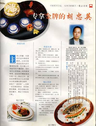 1997年第5期《东方美食》杂志中,胡忠英大师发表的金牌菜品“钱江肉丝”、“鸽蛋鱼圆”和“南方鳜鱼”!