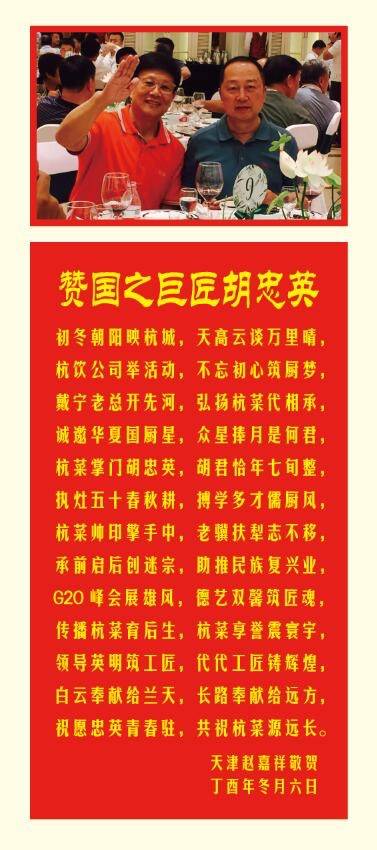 中国烹饪艺术家赵嘉祥大师作诗并送上对胡大师从业50年的敬重和祝贺!