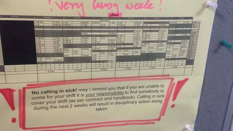排班表下面写着:“不要请病假!容许我提醒你们,如果你不能按时上班,你有责任找其他人来代班。在接下来两周内请病假的话,员工将受纪律处分。”