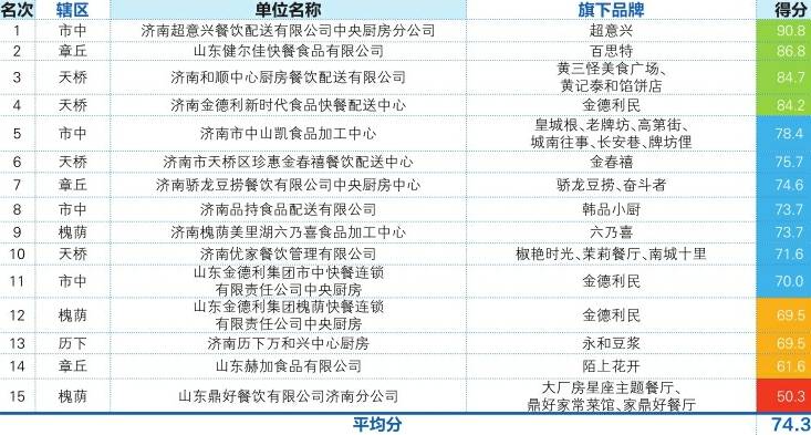 5日,济南市食药监局公布了对辖区15家中央厨房的食品安全评价结果,此次该局进行评价的都是市民最熟悉的餐饮品牌。如下为检查结果: