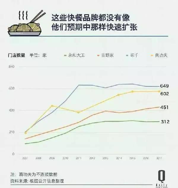 中国的几大快餐,原来都雄心勃勃要在2017-2020年前开到1000家店,但 终的结果是,味千拉面到2017年,门店不增反降,只有649家,真功夫只有602家,永和大王发布千店计划 早,但现在只有312家!吉野家中国只有451家。