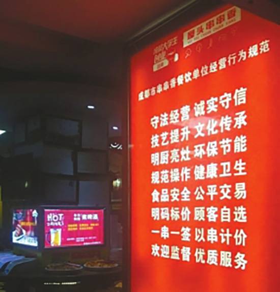 在温江一串串香店,一张红底白字的告示十分醒目,告示上,是64字的行为规范,其中“一串一签”尤其引人关注。