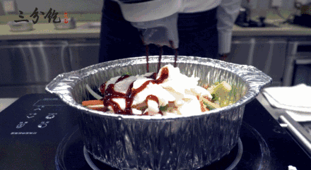 三分饱使用18厘米的铝箔锅,将食客选择的牛肉、鸡肉、鱼片等任一种主料,以及蔬菜类、根茎类、菌菇类配菜,搭配米饭或特制面条,佐以选择的口味酱汁一起进行焖制,只需三分钟,让你吃个饱!