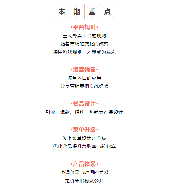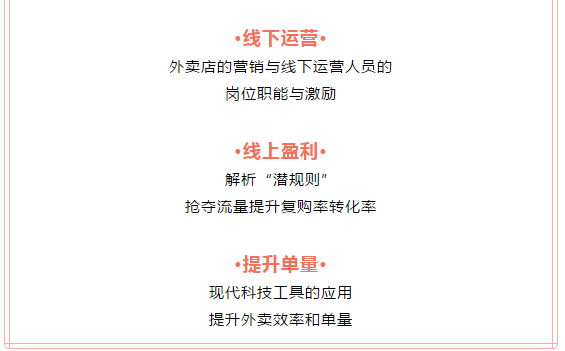 本期重点将总结金百万过去近三年的外卖实战经验,全面复盘金百万年销售额从0到7个亿的方法路径,整个课程体系分为八大模块,覆盖外卖产品、运营、营销的各个方面。外卖新天地,单量增长你想好怎么做了吗?外卖新天地,单量增长你想好怎么做了吗?
