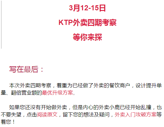 本期KTP外卖四期考察,您除了有以上八项重点的系统梳理,更有外卖线上优化的15道工序详解,步步击破,直击重点。