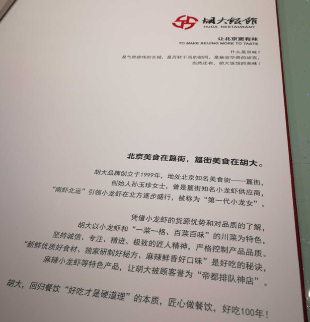 落座以后,翻开菜单,先是品牌的介绍。好餐厅真的不是吹出来的,人家胡大从1999年就开始经营龙虾,多年的沉淀才有今日的辉煌。