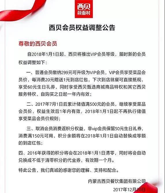 2017年底,西贝莜面村官网就贴出了“西贝会员权益调整公告”,称普通会员缴纳299元可升级VIP,享受菜品会员价,此外还有“消费20元送1元”、“享受西贝甄选商城商品特权”等各类VIP专属的特权。这些特权的有效期只有一年。