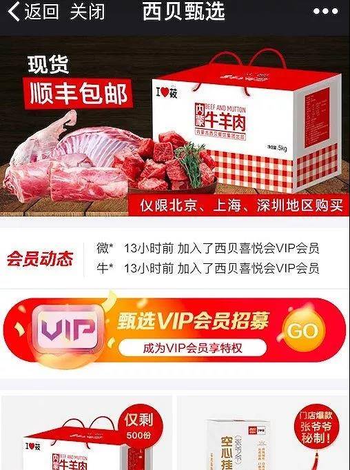 西贝微信公众号的会员卡业面也在大力推广这项新业务,西贝甄选商城中的杂粮、面条等商品均为VIP会员提供了优惠价格。