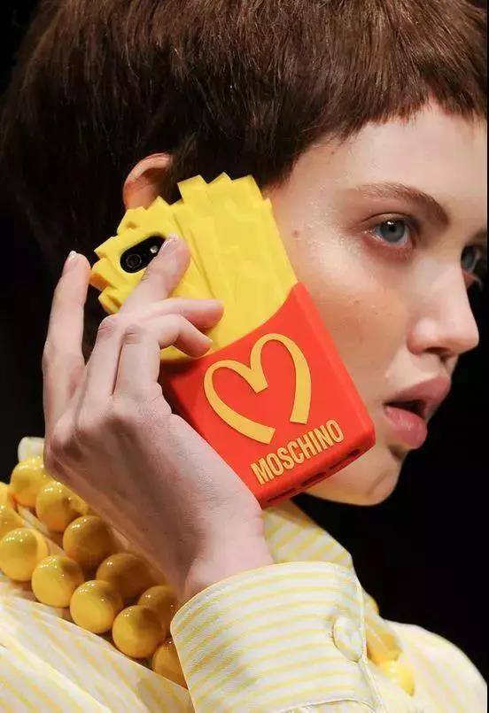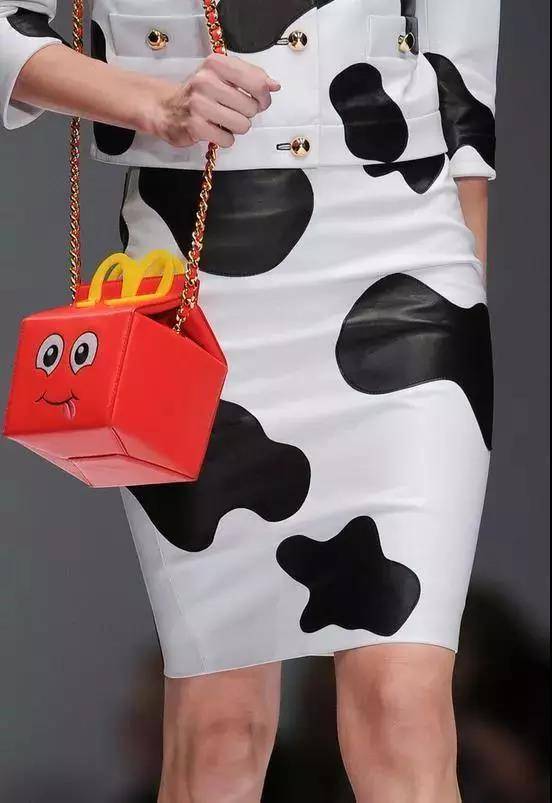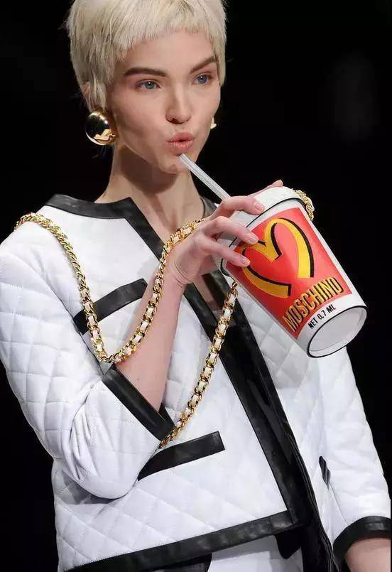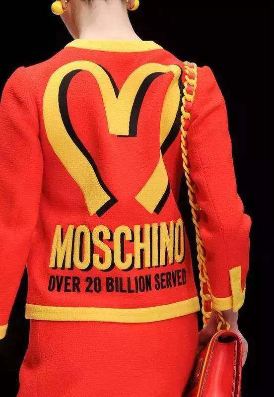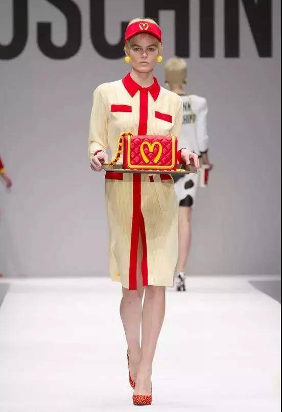 2014年,麦当劳联名设计师 JeremyScott掌舵的 MOSCHINO,在2014秋冬米兰时装周上,展出了各种以麦当劳为灵感设计的服饰、配件等等。
