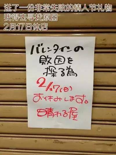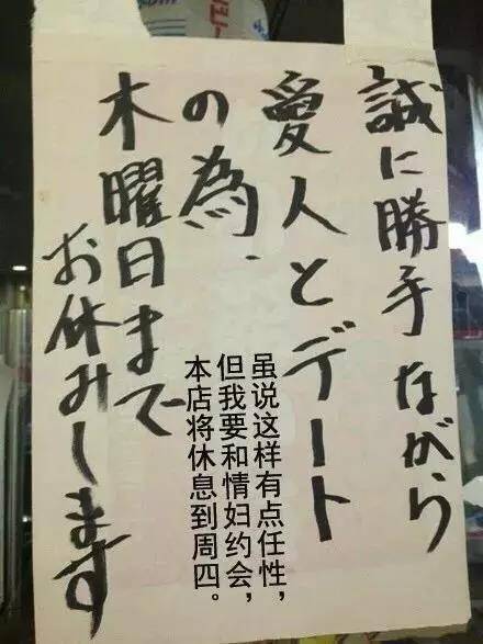 这家店铺就直白很多了,直接把自己歇业的理由挑明了说,但还是让人觉得很有趣,增加了自身店铺的记忆点,周四一过肯定会有食客来问一句:你和你媳妇约会的还顺利吗?