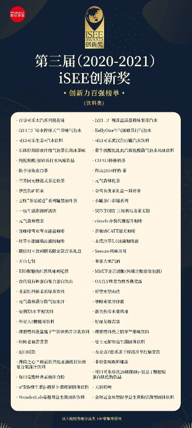 在此次评选活动中,乐体控高膳食纤维气泡茶“长岛冰茶味”获得2020-2021年度第三届iSEE创新奖—创新产品百强(饮料类);同时上榜的还有百科可乐、可口可乐、蒙牛、立顿等。