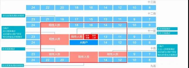 疫情爆发后,通过进一步流行病学追踪,疑似形成了以郑某为中心的“感染圈”,其周边有13家临近商户,其中7家出现了感染者。