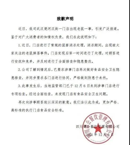 谭鸭血老火锅对其武汉楚河汉街一门店出现老鼠一事作出回应称,近日,门店进行了常规的鼠害消杀处理,消杀期间,出现被大家关注的老鼠掉落事件。门店发现后第一时间进行了处理,对顾客进行安抚和免单,并及时进行了全面排查和隐患整改。此事发生后,当地监管部门已于126日来到涉事门店进行专项检查。经过全面检查,未发现门店有食品安全卫生问题。