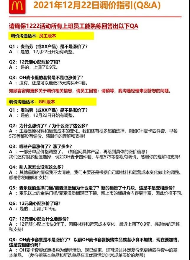 网上还流传一份麦当劳调价沟通话术,12此次随心配涨价了吗?是的,上调了0.9元。为什么涨价,为什么涨了这么多?主要是是因为原材料和运营成本上涨。
