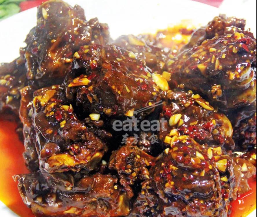 赣菜的特点是:多油、香辣、味浓,因此他增加了卤水中辣椒的用量,卤制80斤筒骨,要下入干辣椒200克,而且为了进一步增加酱骨的风味,还加入了炸金蒜200克。