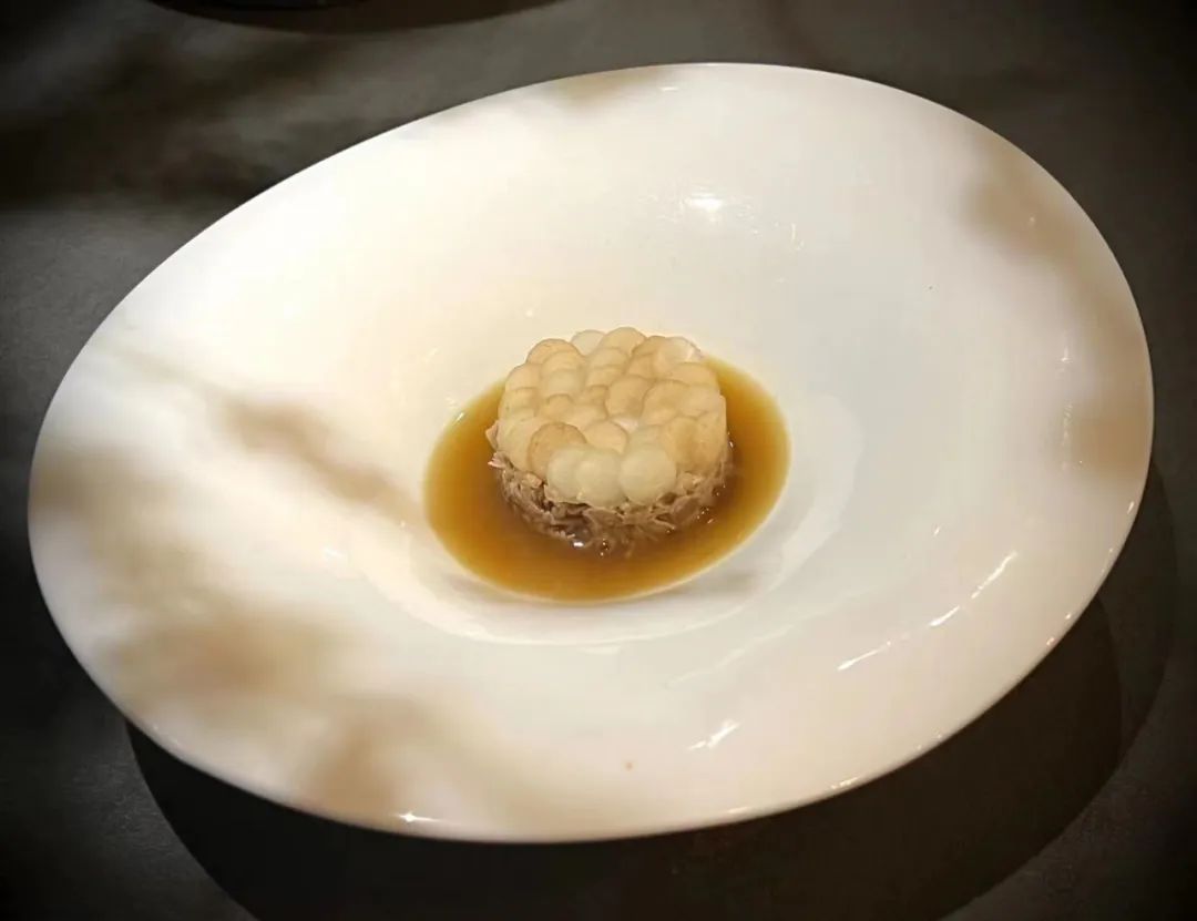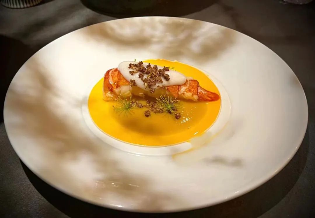 创作灵感:通常讲,波士顿龙虾会被熬成虾汤,为了突出虾汤的风味和层次感,我加入牛骨髓,这就是融合料理最大的特点,以及妙处所在了。放入牛骨髓的经验取决于我对食材、酱料、味型的了解,而所融合出的味道,带给我很多惊喜。