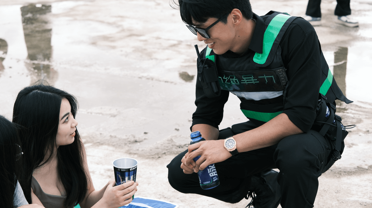 这些暴汗保安还有一个特殊的任务,一旦发现现场有没有进入状态的乐迷,暴汗保安们便会快速出击将他们围住“逮捕”,为他们递上一杯脉动电解质+补充暴汗流失的水分,让不在状态的乐迷们迅速恢复活力,一起感受音乐中的爱与自由,还有暴汗时带来的快乐!