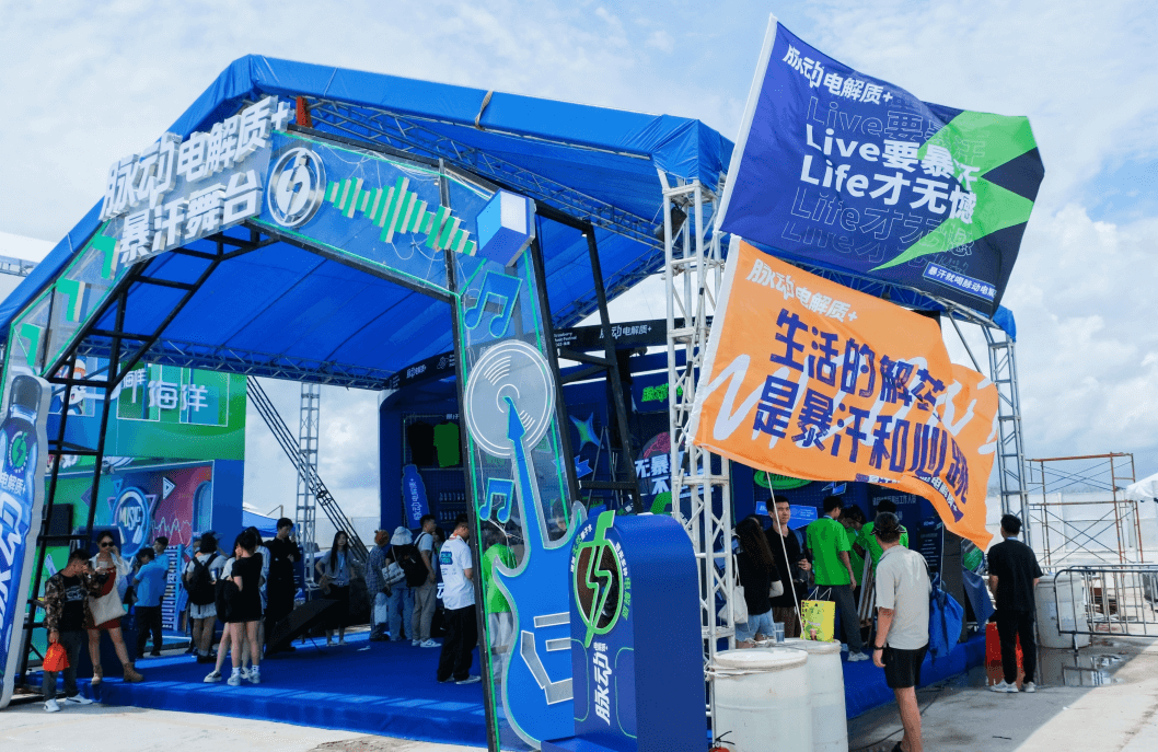 作为一瓶电解质饮料,脉动电解质+一直冲在暴汗最前线,随时随地为暴汗后的人们补充电解质,快速恢复状态。这次珠海草莓音乐节,脉动电解质+在双舞台之间专门搭建了一块打卡互动的区域,鼓励大家和朋友们一起暴汗挑战!