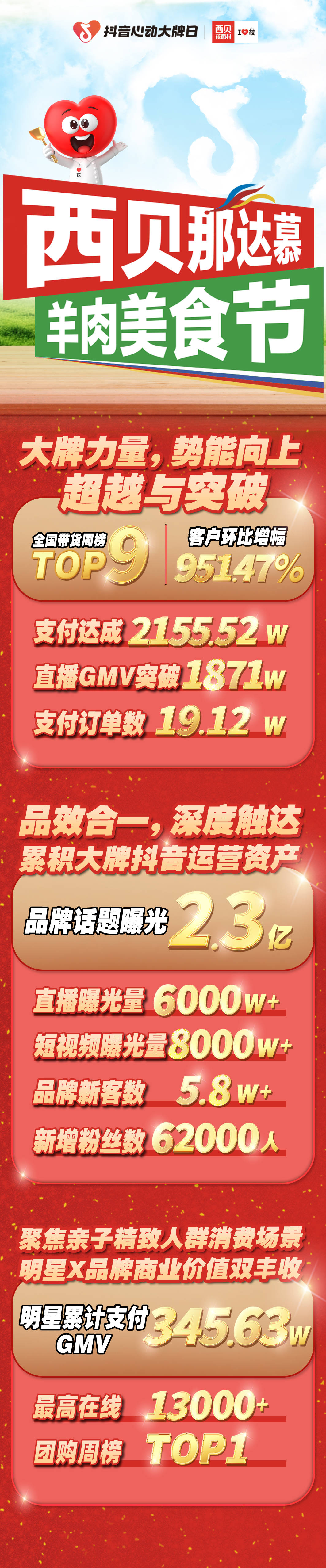 站内抖音心动大牌日联动开屏+阿拉丁+营销标签氛围全部就位,品牌POI页面同步更新抖音心动大牌日联名海报。其中#那达慕羊肉美食节 话题累计曝光超过3200万商业化挑战赛#西贝烤羊有点东西,累计突破3亿次播放,西贝利用“抖音心动大牌日”IP的全域资源扶持,最终打造亿级宣发千万营收的营销案例。