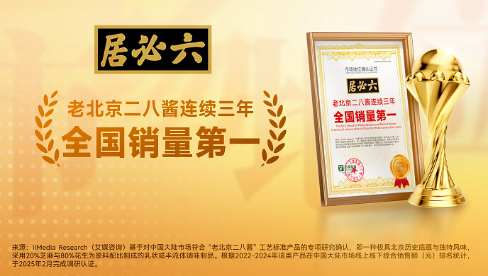 2025年2月,六必居获全球新经济产业第三方数据挖掘和分析机构iiMedia Research(艾媒咨询)授予的“老北京二八酱连续三年全国销量第一”市场地位确认。