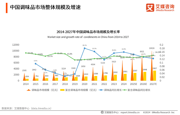 iiMedia Research(艾媒咨询)数据显示,2024年中国调味品的整体市场规模达6871亿元,同比增长16.0% ;2024年中国复合调味品市场规模达2301亿元,复合调味品企业积极扩充产品品类,推行渠道精细化管理,优化销售费用率,提升自身经济效益,为调味品市场发展提供强有力支撑,预计2027年复合调味品市场规模可达3367亿元。