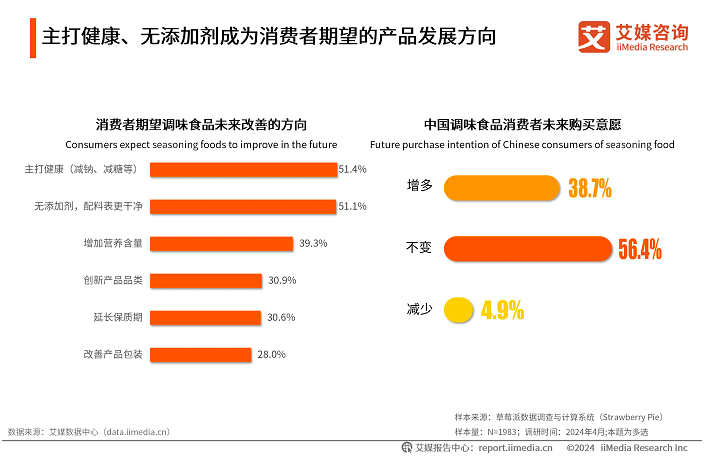 随着健康理念在消费者选购产品时逐渐占据重要地位,调味食品行业正迎来以低钠无添加为核心理念的新消费需求。iiMedia Research(艾媒咨询)数据显示,超半数消费者期望未来调味食品能够往主打健康(51.4%)、无添加剂(51.1%)方向发展;有56.4%的调味食品消费者认为未来购买调味食品的意愿将维持现状,38.7%的消费者则表示未来将更多地购买调味食品。艾媒咨询分析师认为,当代消费者更关注产品安全和健康,不仅限于产品的选材、配料等,还包含营养成分、低钠低糖等。