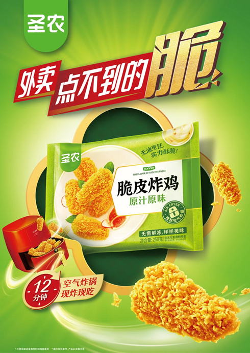 在速食消费升级的浪潮下,圣农敏锐捕捉到家庭场景的差异化需求,推出全新品牌主张——“外卖点不到的脆”,直击外卖炸鸡因配送导致的“回软”痛点,强调圣农产品的现制级酥脆体验。