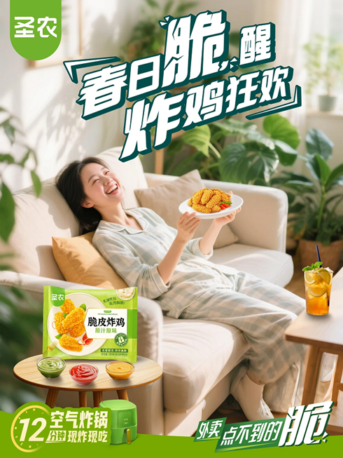圣农成功登顶行业第一的核心策略,在于其定位——“外卖点不到的脆”。这一口号精准切中外卖炸鸡因配送时长导致的“回软”痛点,强调家庭自制场景下现炸现吃的极致酥脆体验。通过深入挖掘“深夜解馋”“宅家追剧”“好友小聚”等夜宵场景需求,圣农将产品与“居家幸福感”深度绑定。