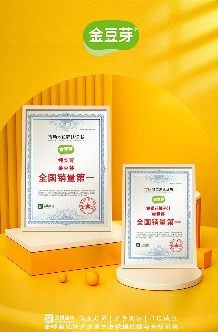 近期,金豆芽获全球领先的新经济产业第三方数据挖掘和分析机构iiMedia Research(艾媒咨询)授予的“金银花柚子汁全国销量第一”“纯梨膏全国销量第一”双项市场地位确认。